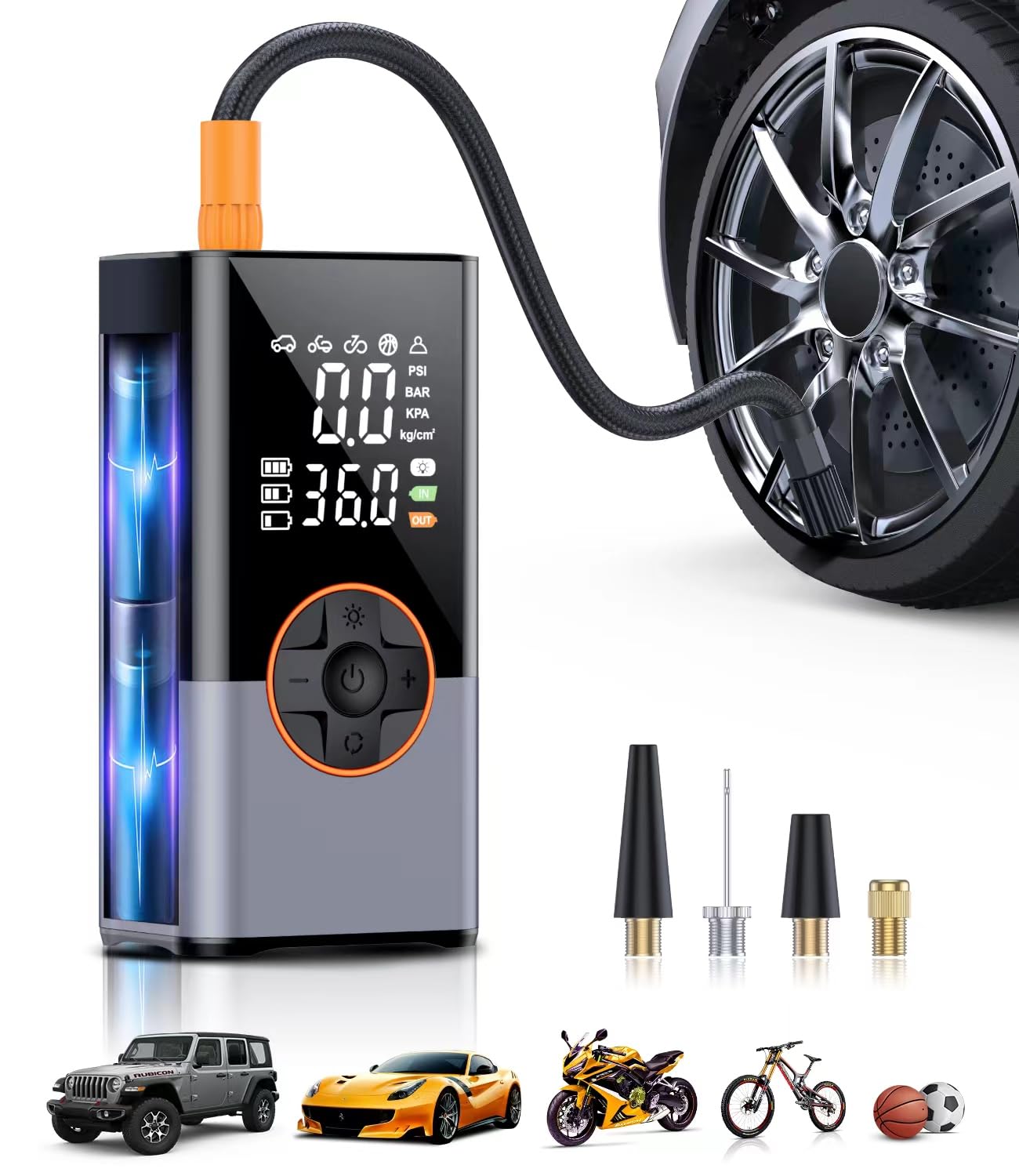 Never get stuck with a flat tire again. This smart, portable air compressor is designed to quickly and accurately inflate your car, bike, scooter, or sports gear in just minutes. Compact, cordless, and rechargeable — it’s built for convenience, safety, and style.
